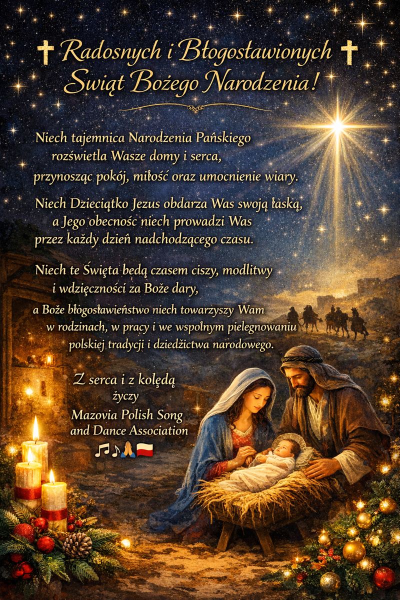 Rycerze Kolumba, Rada im. ks. Jana Otłowskiego, z okazji Świąt Bożego Narodzenia i Nowego Roku 2026, składają Wszystkim Księżom, Siostrom Dominikankom, Wszystkim Organizacjom Polonijnym i Całej Parafii Życzenia Zdrowych i Pogodnych Świąt. Niech ten czas spędzony w gronie najbliższych będzie Wyjątkowy i Moc Wigilijnego Wieczoru przyniesie Spokój i Radość, a Boża Dziecina niech Błogosławi i Towarzyszy Wam przez Całe Życie. Wielki Rycerz- Piotr Urban