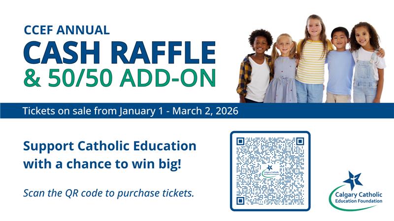 The Calgary Catholic Education Foundation (CCEF) is back with Alberta’s largest Catholic school-supporting raffle—running January 1 to March 2, 2026—in support of Catholic education for 64,000 students across 120 schools in Calgary and area. This year includes 4 Early Bird cash draws with prizes totaling $20,000, plus the 50/50 with a chance to share in a $1 million pot. When you purchase, be sure to add on the 50/50 and select your school in the drop-down so it can share in the 50/50 proceeds. Thank you for supporting Catholic education in our community. Tickets start at $10 and can be purchased here: https://bit.ly/CCEFRaffle