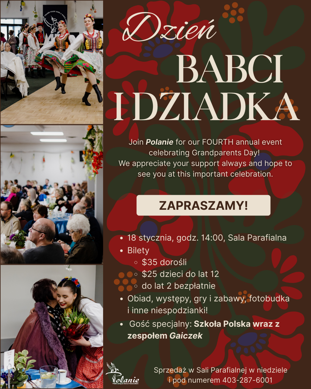 Zespół „Polanie” serdecznie zaprasza, już po raz czwarty, na wspólne świętowanie z okazji Dnia Babci i Dziadka. Uroczystość, z udziałem dzieci ze Szkoły Polskiej i zespołu „Gaiczek”, odbędzie się 18 stycznia o godz. 14:00 w Sali Parafialnej. W programie imprezy obiad, program artystyczny, zabawy, fotobudka i inne niespodzianki. Sprzedaż biletów ($ 25 dzieci, $ 35 dorośli) w Sali Parafialnej i pod numerem telefonu 403 287 6001