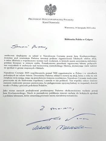Jest nam bardzo miło poinformować, że Narodowe Czytanie w Calgary, które odbyło się 28 września 2025 w Domu Polskim, a którego współorganizatorem była nasza Biblioteka, zostało docenione przez Kancelarię Prezydenta RP. Otrzymaliśmy list z podziękowaniem za zorganizowanie i przeprowadzenie tego wydarzenia. Od 2012 roku Narodowe Czytanie w Polsce i zagranicą odbywa się pod patronatem Pary Prezydenckiej. Jeszcze raz dziękujemy wszystkim uczestnikom i współorganizatorom! Załączamy kopie listu.